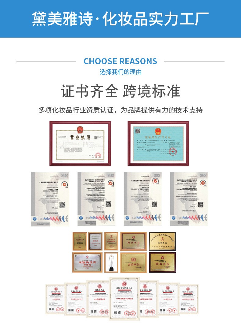 广东黛美雅诗化妆品有限公司,化妆品OEM/ODM源头实力工厂,专业生产化妆品oem/odm一站式加工服务。产品种类有:洁面类、化妆水类、卸妆类、面膜类、粉底类、气垫类、精华类、原液类、面霜类、乳液类、眼部类、手部类、足部类、洗护类、母婴类、男士等系列产品。专业化妆品oem/odm一站式服务,提供证件、产品备案。5000多种成熟配方任您选择!把您的需求告诉黛美雅诗,接下来我们专业团队一条龙全程为您服务,做到全程无忧。客户满意,就是我们前进的动力。
